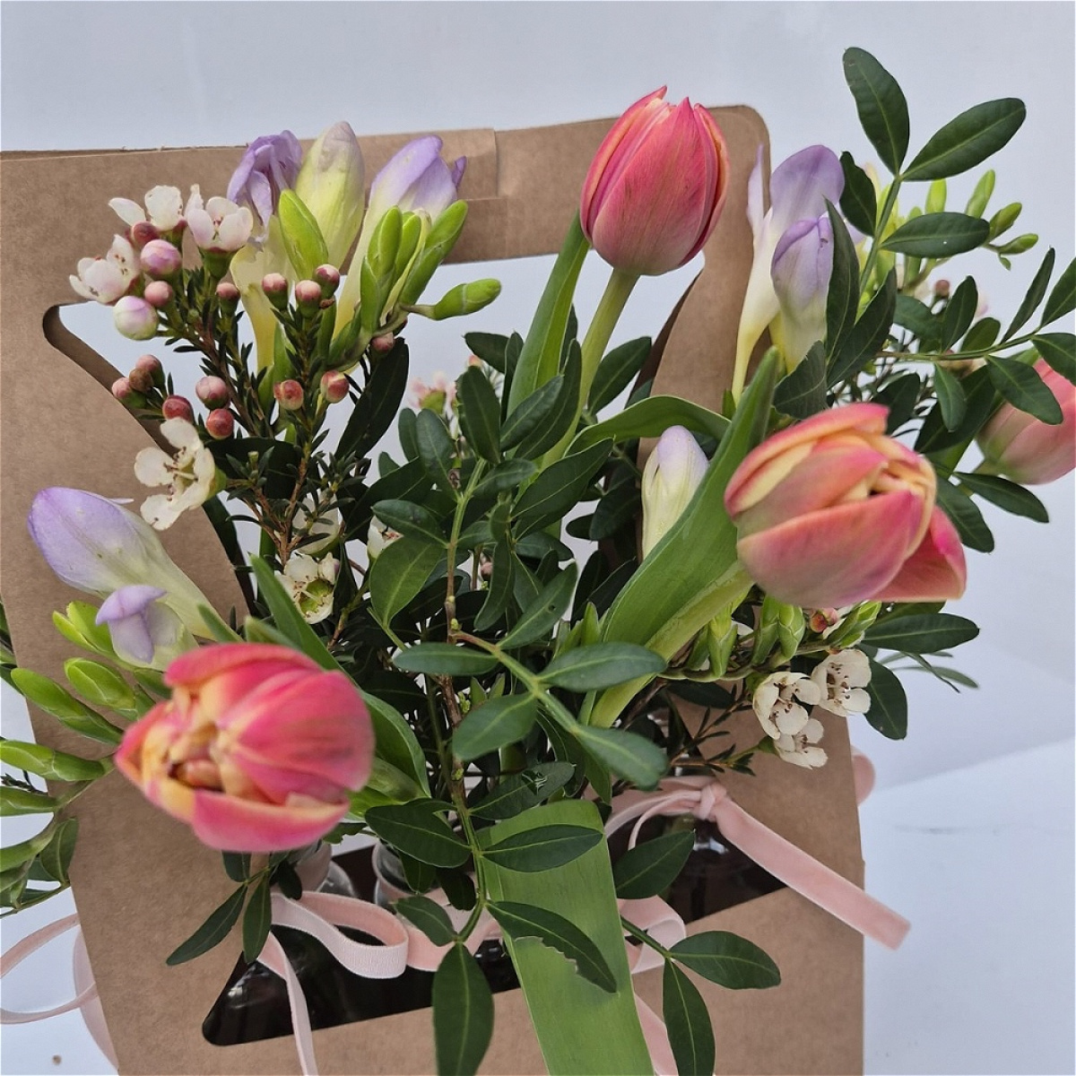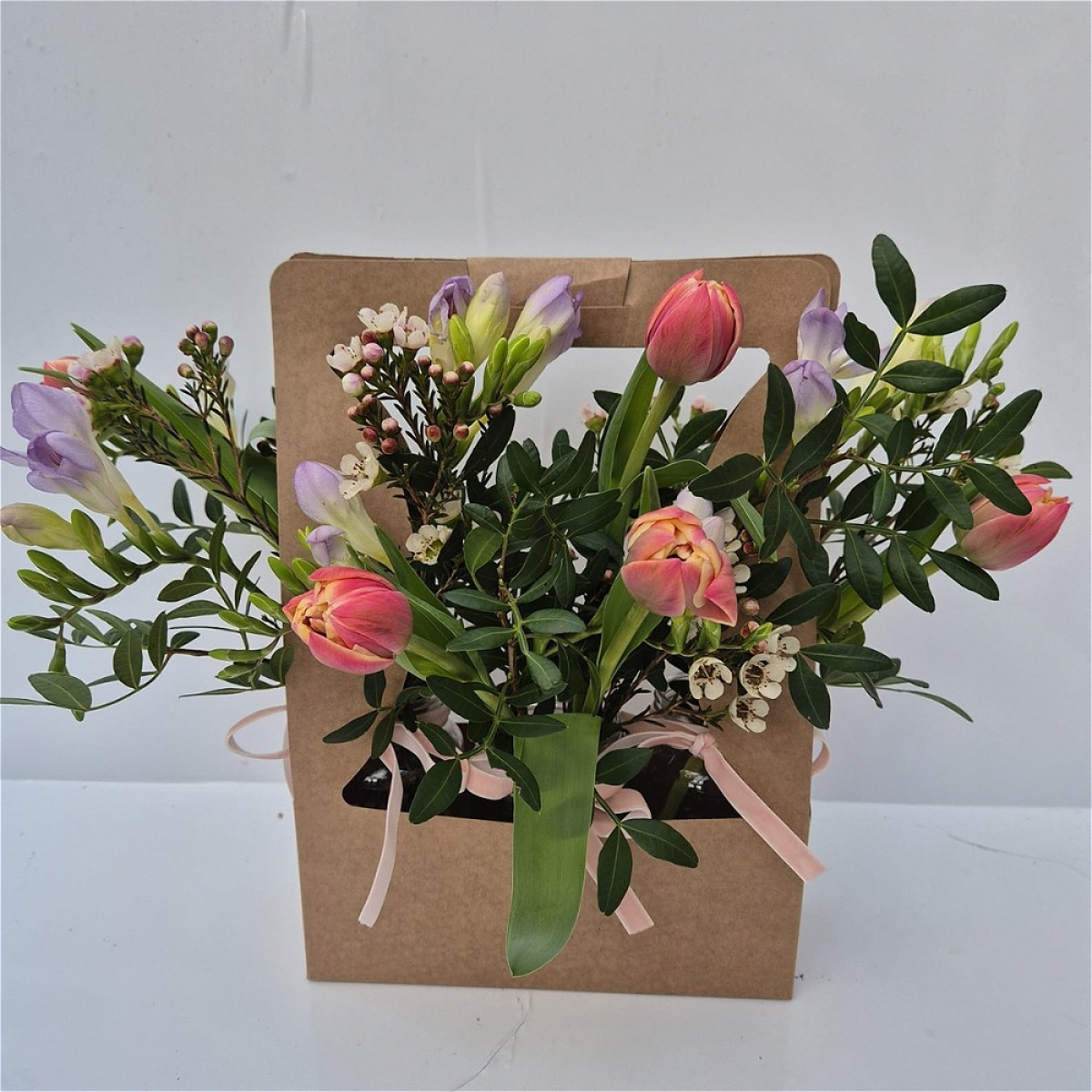 Little bit different this one and we love it. Filled with fragrant fressias, wax flower and special tulips. This Kraft bag is literally bursting with flowers.